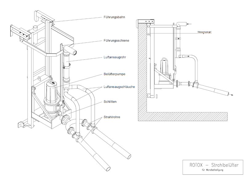 Parallel zur Strömungsrichtung sind Schwimmtanks aus UV- beständigem PE angeordnet. Die Belüftungseinheit wird mittels einer Haltestange mit Gelenken und Edelstahlseilen am Fundament und an der Böschung befestigt.