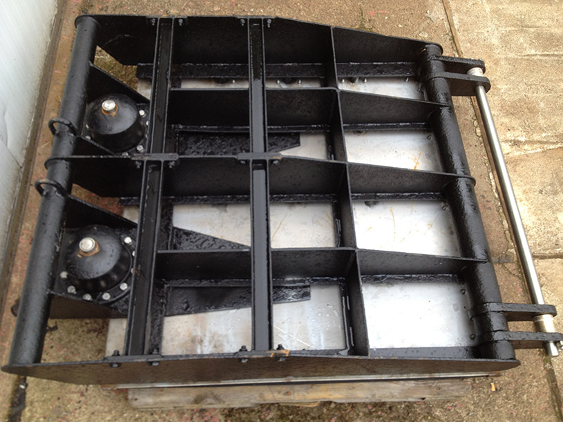 Bis zu einer Breite von 3000mm können zwei Führungsbahnen verwendet werden. Die Rechenreinigung als kompakte Konstruktion ist lediglich an zwei Punkten an den gegenüberliegenden Wänden des Einlaufbauwerkes kippbar gelagert und befestigt. Die Anlage liegt auf der Sohle des Rechenbauwerkes auf und kann für Reparatur- und Wartungszwecke aus dem Wasser geschwenkt werden. Der Rechenreinigungskamm ist umlaufend und greift in die Zwischenräume der Stäbe, womit auch stark verkrautetes Gut entfernt werden kann.